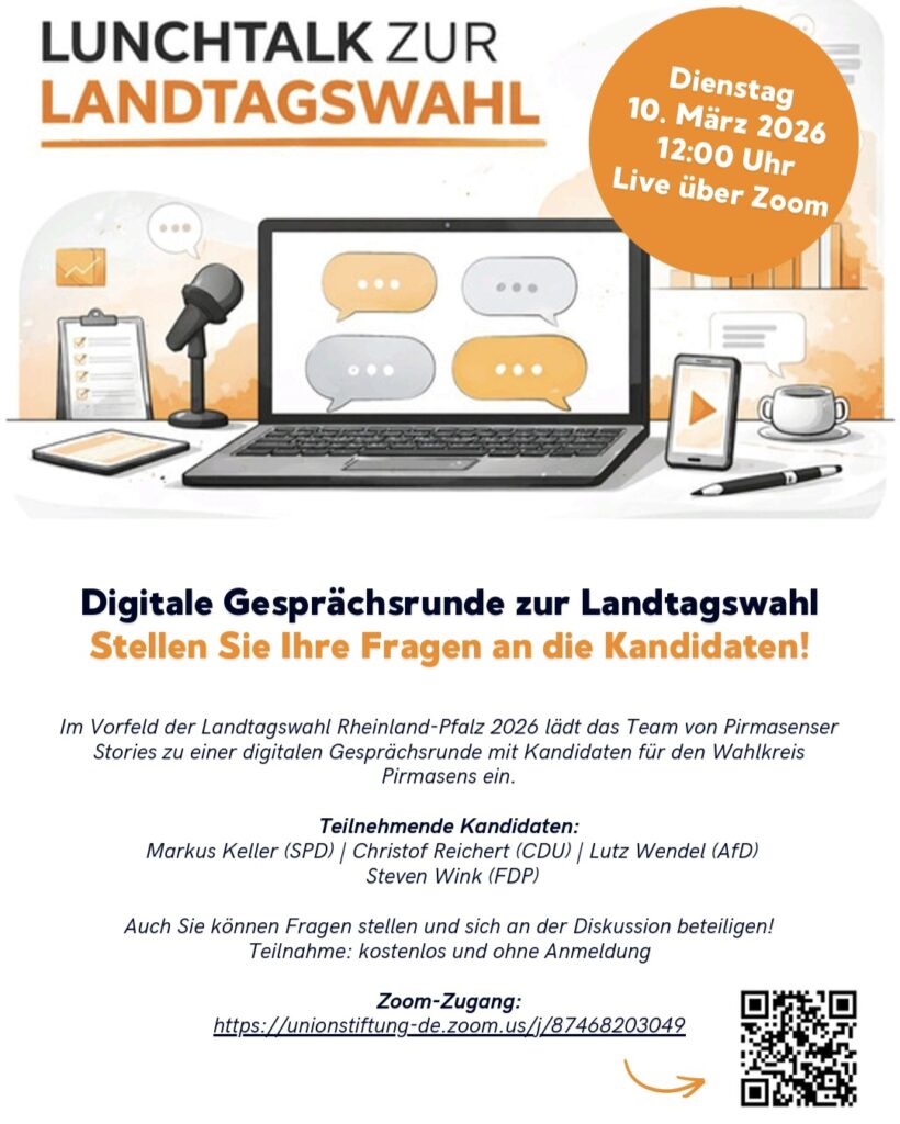 Im Vorfeld der Landtagswahl in Rheinland Pfalz organisiert das Redaktionsteam von Pirmasenser Stories eine digitale Gesprächsrunde mit Kandidaten für den Wahlkreis Pirmasens. Der Lunchtalk findet morgen, Dienstag, dem 10. März, um 12 Uhr statt und wird live über Zoom und […]