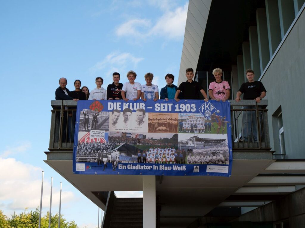 Neben dem Hörbeitrag gestalteten die Gymnasiasten auch ein großformatiges Banner mit dem Titel „Ein Gladiator in Blau-Weiß“. Die Collage zeigt unter anderem das inzwischen abgerissene Stadion an der Zweibrücker Straße, historische Mannschaftsbilder sowie Fan-Grüße aus verschiedenen Jahrzehnten.