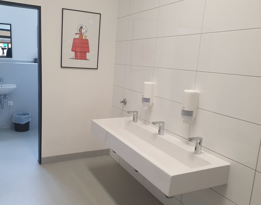 Die WC-Anlage war dringend modernisierungsbedürftig: Ein Großteil der Ausstattung stammte noch aus dem Baujahr der Schule, Kabinenwände waren beschädigt oder mit Kritzeleien versehen, die kleinteiligen Fliesen schwer zu reinigen. Auch die sanitären Einrichtungen selbst entsprachen nicht mehr dem heutigen Standard.