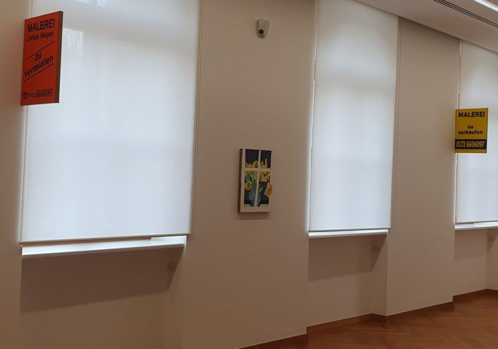 Im Erdgeschoss zeigt Jonas Mayer Arbeiten, die auf Beobachtungen und Fundstücken aus dem Stadtraum basieren. Der Künstler hat Pirmasens zu Fuß erkundet, fotografisch dokumentiert und dabei eine visuelle Sammlung urbaner Merkwürdigkeiten angelegt – von übertriebenen Absperrungen bis hin zu grellen Immobilienanzeigen in Neonfarben. Diese Fotografien dienen Mayer als Rohmaterial für seine Malereien, in denen die Realität mal detailgetreu, mal verfremdet wiederkehrt.