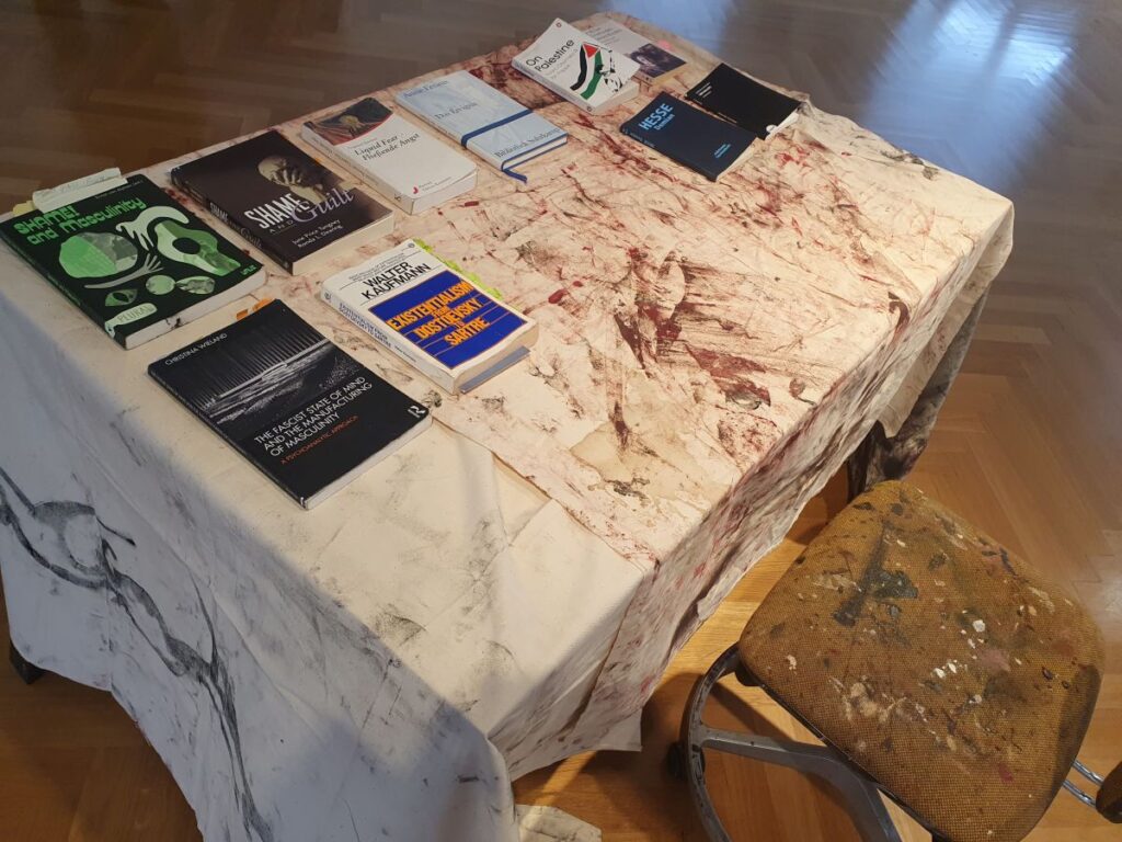 Zentraler Bestandteil seines Ausstellungsraums ist ein Tisch aus seinem Atelier, der als offenes Quellenverzeichnis fungiert. Hier liegen Bücher, Notizen und Markierungen, die Einblick in den Denk- und Schaffensprozess des Künstlers geben. Der Tisch lädt das Publikum ein, sich durch persönliche Spuren und Referenzen einen eigenen Zugang zu den ausgestellten Werken zu erarbeiten.