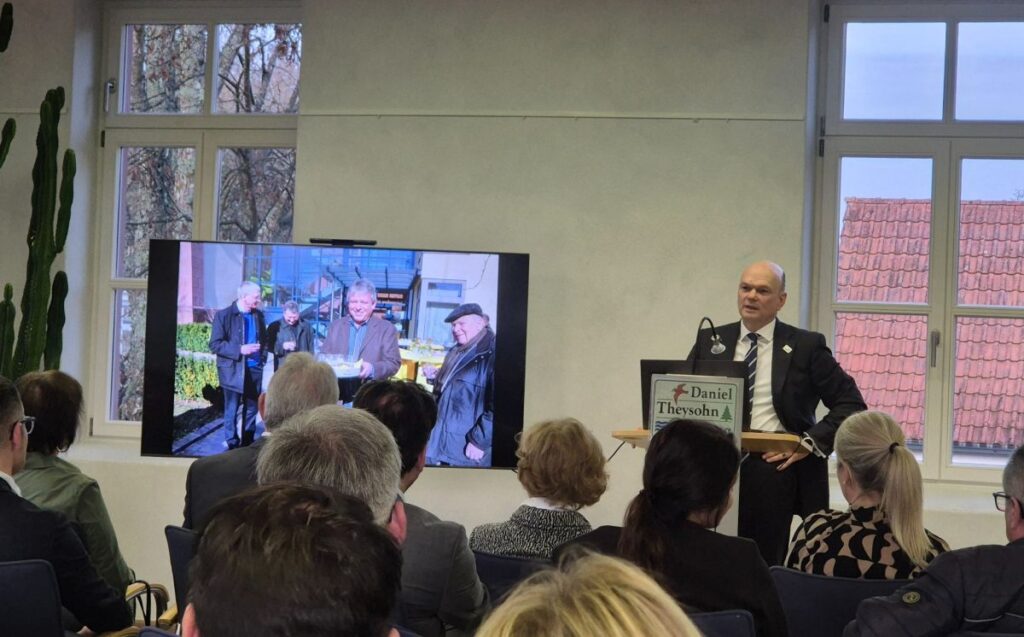 Ein überraschend emotionaler Moment der Feierstunde folgt der Rede von Landrätin Dr. Susanne Ganster. Sie erinnert an den Stifter Daniel Theysohn und dessen außergewöhnliche Entscheidung, sein Lebenswerk in den Dienst der Allgemeinheit zu stellen. Andreas habe diesen Gedanken über Jahrzehnte hinweg mit Leben gefüllt und Verantwortung für eine wirtschaftlich herausgeforderte Region übernommen.