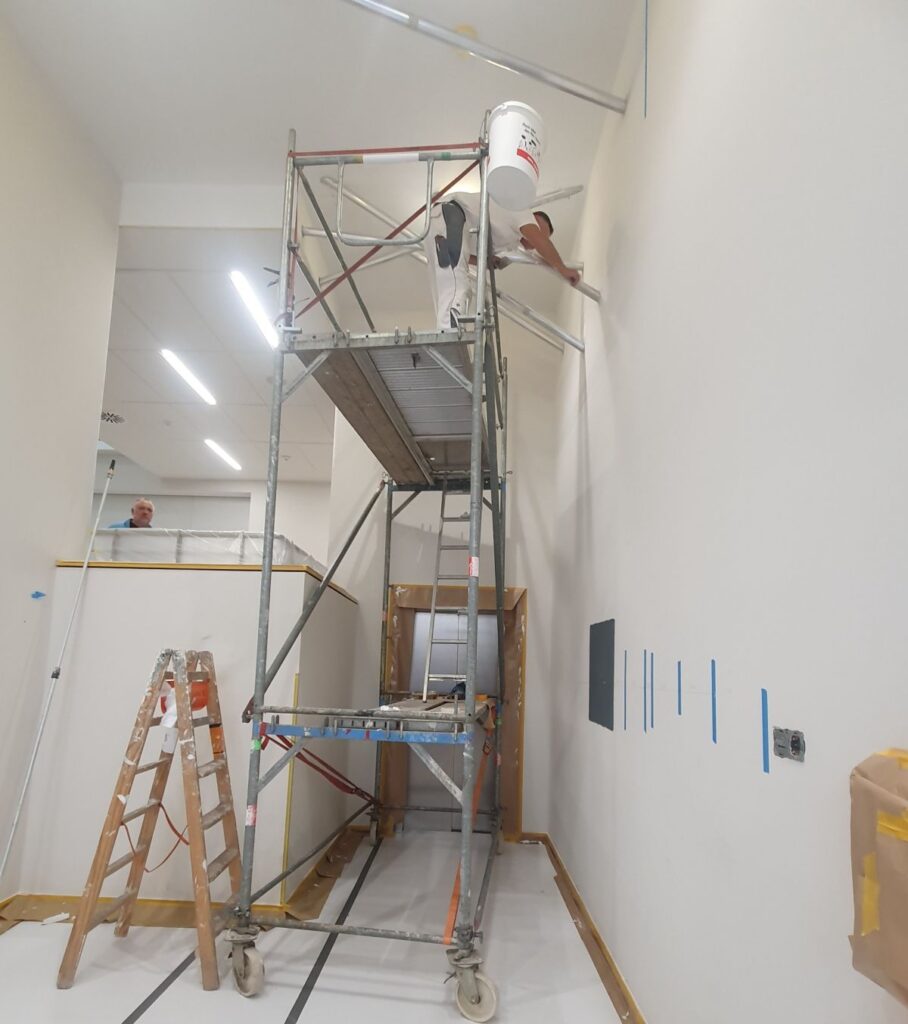 „Ich bespiele den Raum als Ganzes“, betont Theinkom. „Nicht nur eine Wand oder eine Fläche. Ich will, dass sich der gesamte Raum verändert, dass er sich je nach Standpunkt anders anfühlt.“ Auch die Architektur wird zum Teil der Arbeit: Wandvorsprünge, Deckenabsätze und sogar funktionale Elemente wie Spinde und Sitzbank werden bewusst integriert statt verdeckt. „Diese Dinge gehören zum Raum – und damit auch zur Gestaltung.“