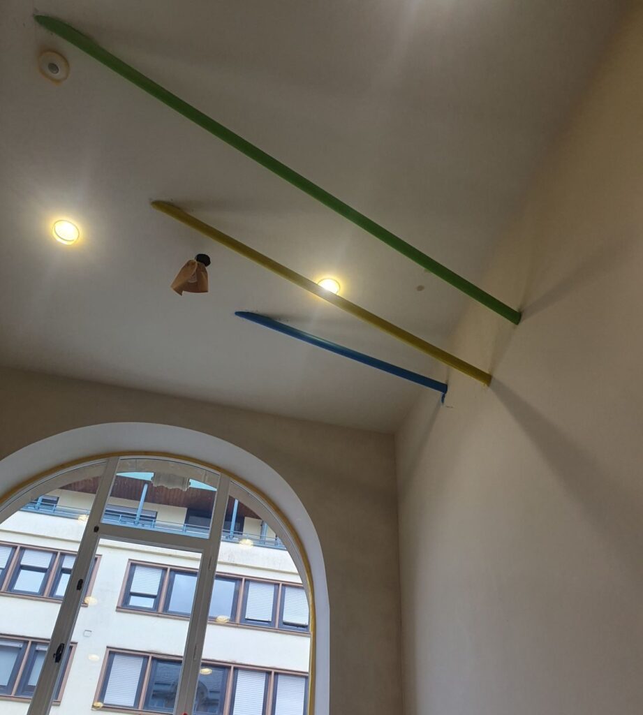 „Das Nest ist für mich ein Sinnbild“, erklärt Theinkom. „Ein Ort des Schutzes, aber auch ein Ort des Aufbruchs.“ Der hintere Bereich des Flurs, der bisher kaum genutzt wurde, wird so zum emotionalen Zentrum der Installation. In diesem „Knotenpunkt“, wie sie ihn nennt, überlagern sich Farbe, Licht und Raumwirkung.