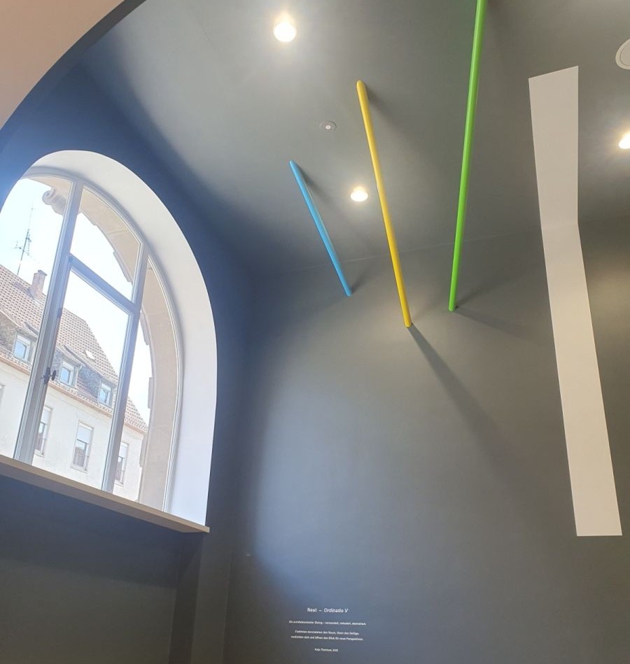 Theinkom hatte sich im Frühjahr gegen insgesamt 71 Mitbewerberinnen und Mitbewerber durchgesetzt und war als Siegerin aus dem Kunst-am-Bau-Wettbewerb hervorgegangen. Die Realisierungssumme betrug rund 40.600 Euro. Für die Jury war entscheidend, dass die Installation einen deutlichen Bezug zur Architektur des Hauses herstellt und sowohl den historischen Altbau als auch den modernen Neubau einbezieht.