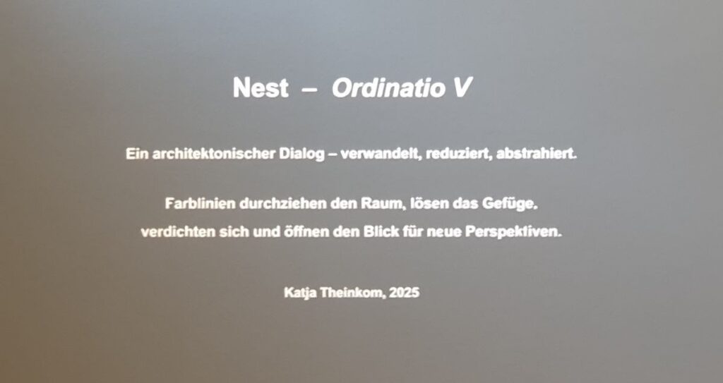 Die Komposition setzt auf grafische Strukturen, die sich im Raum entfalten und durch farbige Aluminiumröhren aufgebrochen werden. „Wenn Sie den Eingang anschauen, dann ist das Nest viel verdichteter. Wenn Sie durch den Raum gehen, beginnen die optischen Kreuzpunkte sich wieder aufzulösen“, so die Künstlerin. Auf diese Weise verändert sich der Eindruck je nach Standpunkt des Betrachters.