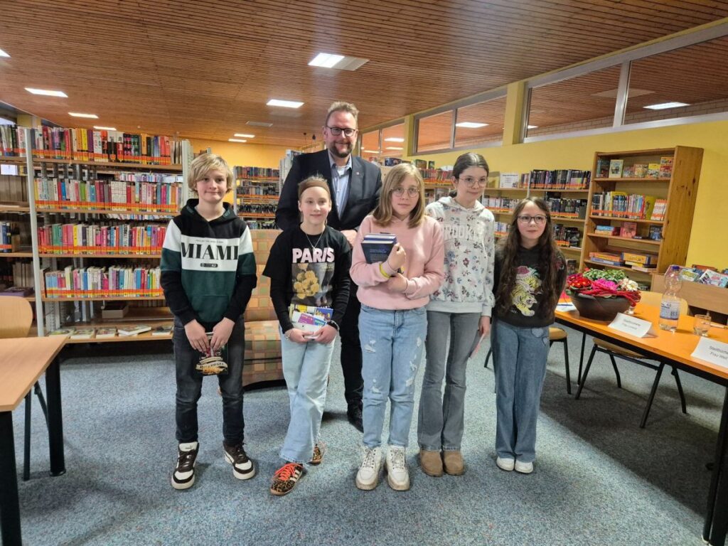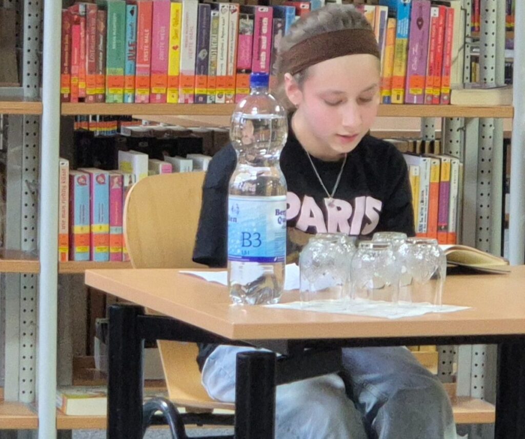 Im ersten Durchgang lasen die Kinder jeweils einen vorbereiteten Abschnitt aus einem selbst gewählten Buch. Die Auswahl zeigte eine große Bandbreite an Genres und Themen. Siegerin Lotta Maurer entschied sich für „Die goldene Schreibmaschine“ von Carsten Henn. Leonard Caprano trug aus „Die Jagd nach dem geheimnisvollen Rollsiegel“ von Karim Pieritz vor. Paula Helfrich wählte „Die Duftapotheke“ von Anna Ruhe. Maya Hunsicker las aus „White Fox“ von Chen Jiatong, Joannah Lang aus „Geisterjäger“ von Cornelia Funke.