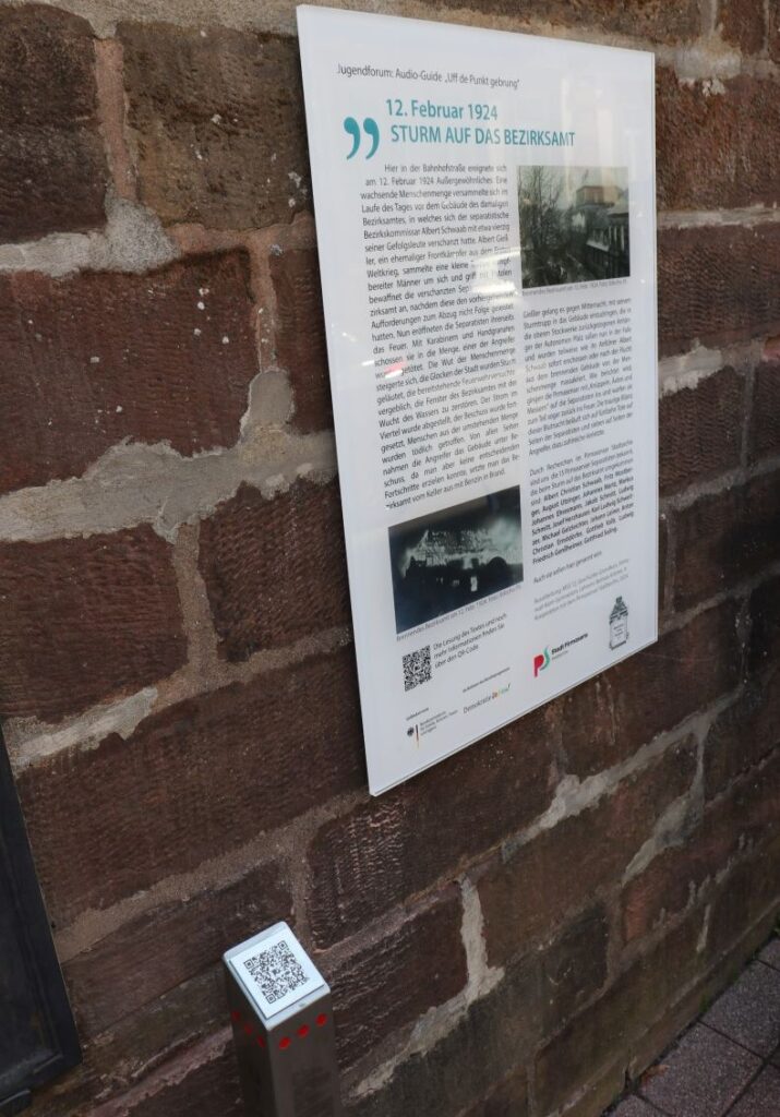 Die Station befasst sich mit den Ereignissen rund um den Separatistenaufstand von 1924. Schülerinnen und Schüler der MSS 12 des Immanuel-Kant-Gymnasiums haben gemeinsam mit ihrer Lehrerin Barbara Krämer sowie dem Stadtarchiv die Inhalte erarbeitet. Sie griffen auf zahlreiche Originaldokumente zurück und beleuchteten die Ursachen, Motive und gesellschaftlichen Spannungen, die schließlich in einer blutigen Eskalation mündeten.