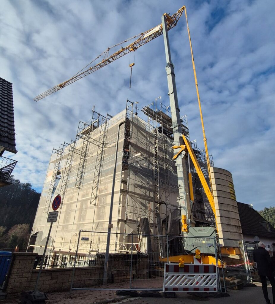 Architekt Christoph Arnold, der mit seinem Pirmasenser Büro arnold + partner die Planung verantwortet, erläuterte die bauliche Komplexität der Dachsanierung. Er lobte den Mut der Gemeinde, dieses anspruchsvolle Projekt anzugehen, und hob die gute Zusammenarbeit mit spezialisierten Fachfirmen hervor. Die Sanierungsarbeiten finden unter strengen denkmalschutzrechtlichen Auflagen statt und werden von erfahrenen Unternehmen aus der Region ausgeführt. So wurde ein spezielles Kuppelgerüst von Gerüstbau Benoit (Dellfeld) errichtet. Die Neueindeckung des Schieferdachs übernimmt die Reiner-Dach GmbH (Dörth), während die Zimmerei Zimmermann (Zweibrücken) die notwendigen Zimmerer- und Schalungsarbeiten am Dachstuhl durchführt. Die metallene Dachspitze samt Wetterhahn wird von Metallgestaltung Schmidt (Höheischweiler) restauriert.