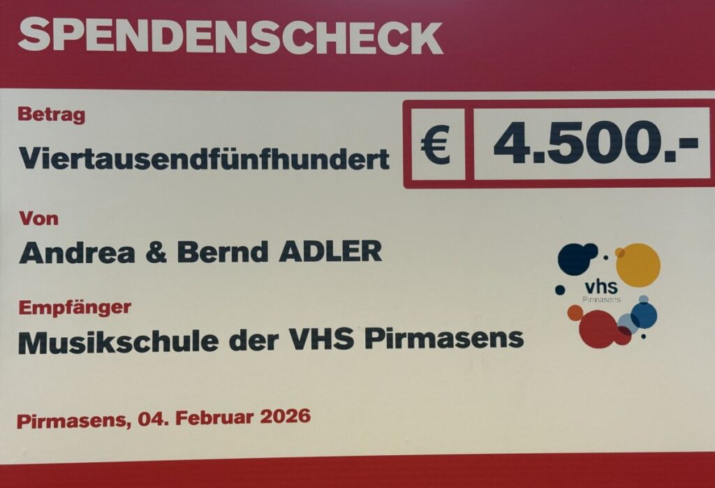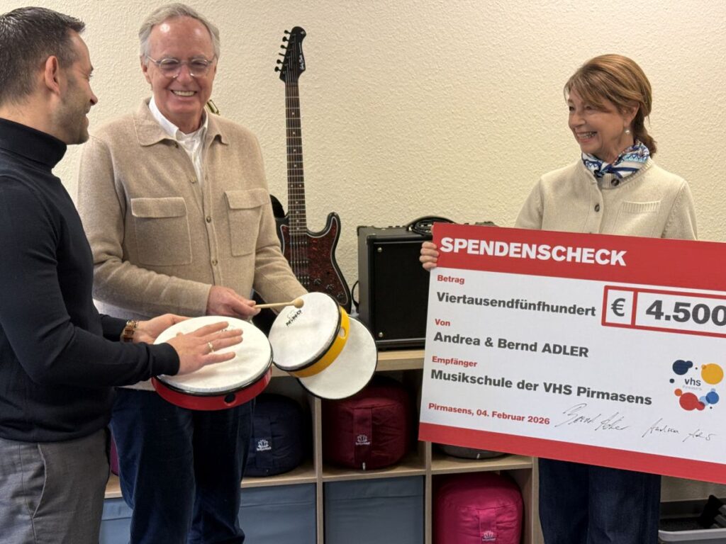 Der schwarze Flügel glänzt wie frisch gestimmt, in den Regalen liegen bunte Sitzkissen, an den Wänden lehnen Instrumente, die darauf warten, in kleine Hände zu wandern. Es ist ein ruhiger Vormittag in der Volkshochschule Pirmasens, doch zwischen Holz, Stoff und Tasten scheint bereits ein leiser Auftakt zu klingen. Mit einem Spendenscheck über 4.500 Euro haben Andrea und Bernd Adler der Musikschule der VHS ermöglicht, ein lange vermisstes Angebot wieder anzustimmen: die musikalische Früherziehung für Kinder.