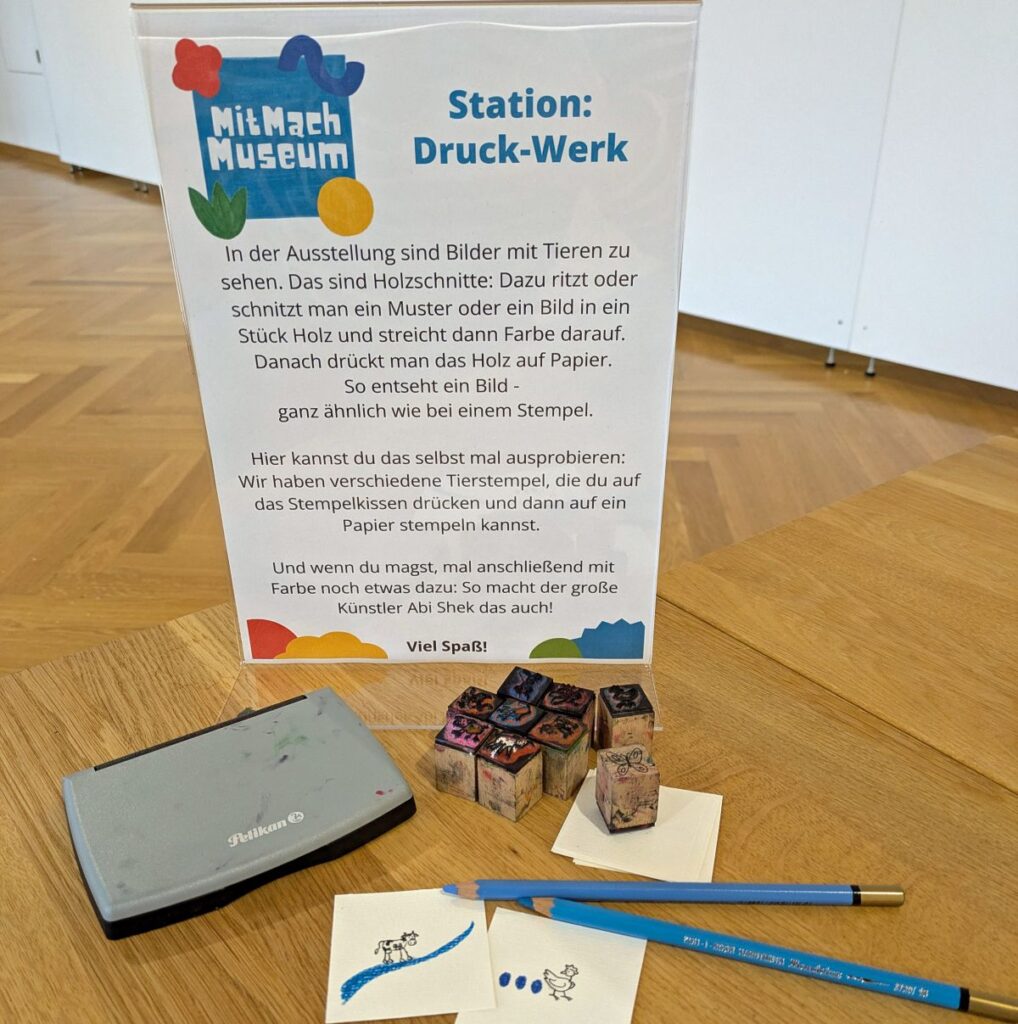 An der Kreativstation „Druck Werk“ können Besucher mit Tierstempeln kleine Kärtchen gestalten und diese anschließend mit Buntstiften weiter ausarbeiten. Die Arbeiten dürfen mit nach Hause genommen werden.