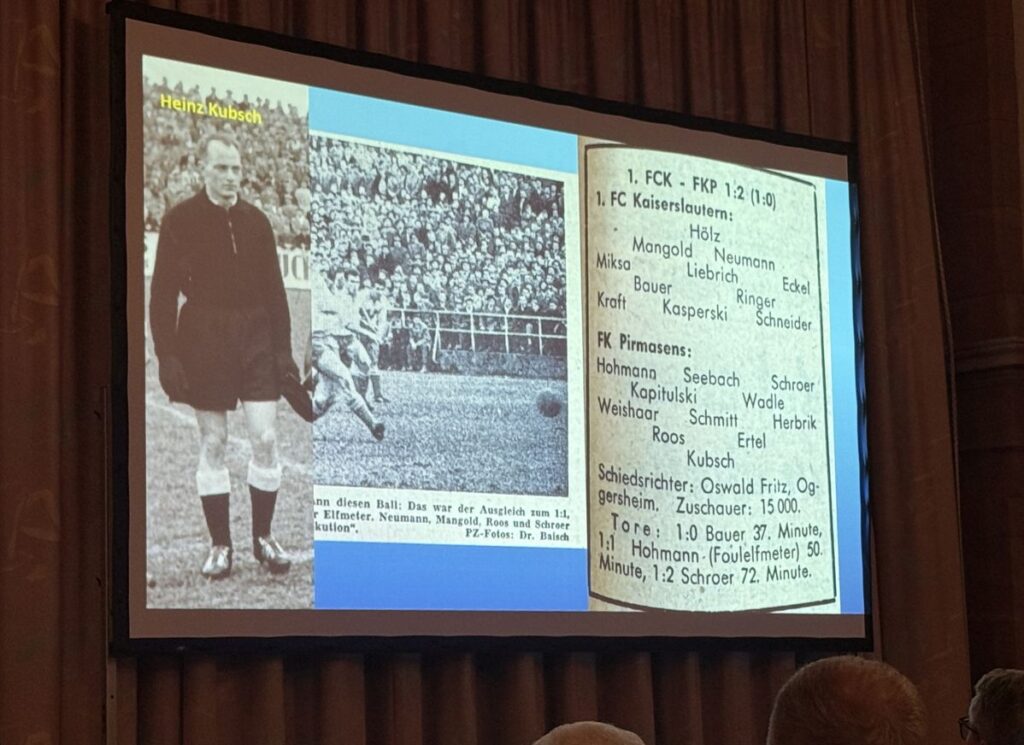 Dass diese Rivalität tiefe Wurzeln hat, zeigte ein Blick ins Jahr 1942. Der FKP trat stark geschwächt auf dem Betzenberg an, viele Spieler waren im Gegensatz zu den Lauterern an der Front. Das Ergebnis: 0:26. Dreizehn Tore durch Fritz Walter, der später gesagt haben soll: „Heute ist Gelegenheit zum Toreschießen.“ Ein Satz, der bis heute nachhallt. Und eine Geschichte, die Fragen aufwirft, auch moralische. „Wer hat sportlich gehandelt?“, zitierte Salzmann eine damalige Zeitungsfrage. Eine Antwort blieb offen. Vielleicht bewusst! Viel lieber erinnerte man sich im Saal an die großen Triumphe. 1959, ein 2:1-Sieg auf dem Betzenberg vor 15.000 Zuschauern. Eine der glanzvollsten Epochen des Vereins, als der FKP dreimal Südwestmeister wurde und die klare Nummer eins der Region war. Geschichten, die das FKP-Herz erwärmen und die Augen der Zuhörer glänzen lassen.