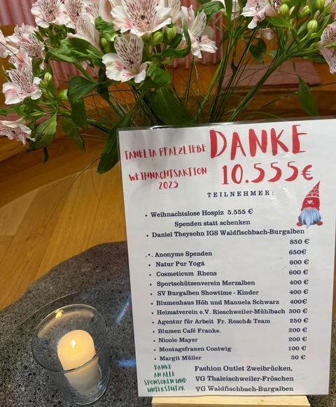 Einen besonders großen Beitrag leistete die Aktion „Weihnachtslose Hospiz – Spenden statt schenken“ mit 5.555 Euro. Weitere Spenden kamen von Daniel Theysohn von der IGS Waldfischbach Burgalben mit 850 Euro, von Natur Pur Yoga mit 600 Euro sowie vom Cosmeticum Rhens, ebenfalls mit 600 Euro. Eine anonyme Spende belief sich auf 650 Euro.