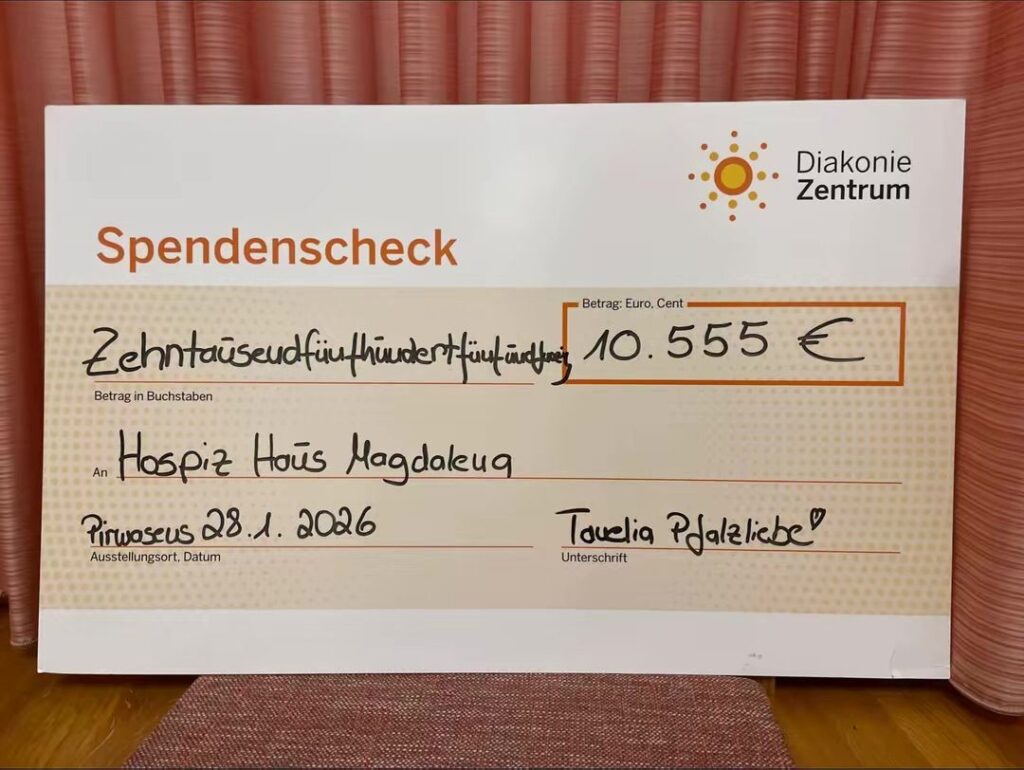 Der Spendenscheck wurde stellvertretend für alle Beteiligten an Hospizleiterin Simone Jennewein, Stellvertretende Hospizleiterin Nicole Stein sowie an den Vorstand des Diakoniezentrums Pirmasens, Carsten Steuer, überreicht. Organisatorin „Tanelia Pfalzliebe“ machte bei der Spendenübergabe deutlich: „Diese Spende steht für weit mehr als eine Zahl. Sie steht für Nähe, Unterstützung und Würde in schweren Lebensphasen“. Die große Beteiligung zeige, wie stark der Zusammenhalt in der Region sei und wie viele Menschen bereit seien, soziale Verantwortung zu übernehmen. Die gesammelten Spenden tragen dazu bei, die Arbeit des Hospiz Haus Magdalena langfristig zu sichern und schwerstkranke Menschen sowie ihre Angehörigen würdevoll zu begleiten.
