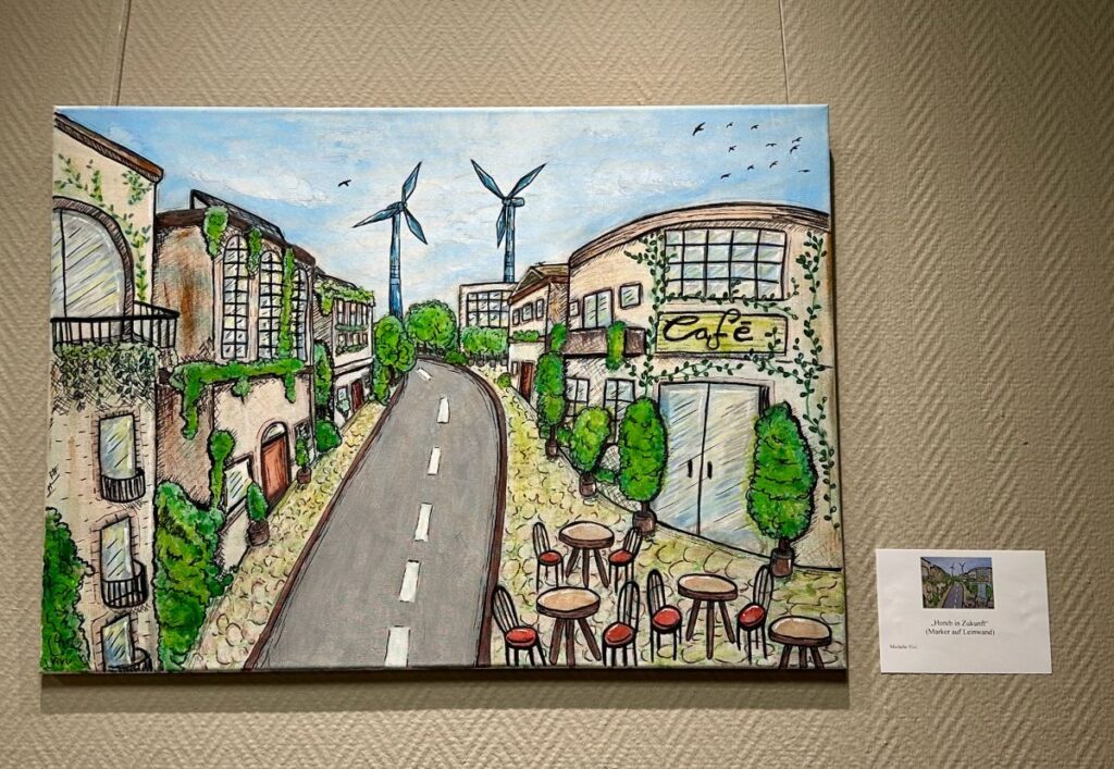 Die Bilder unterscheiden sich nicht nur in ihrer Gestaltung, sondern auch inhaltlich deutlich voneinander. Zwar stammen alle Teilnehmenden aus Pirmasens, doch ihre Vorstellungen davon, wie ihre Heimatstadt künftig aussehen soll, sind vielfältig. Immer wieder tauchen bekannte Orte der Stadt auf, jedoch kreativ neu gedacht und weiterentwickelt. An den Schlosstreppen sprießen Blumen, auf dem Horeb drehen sich Windräder. Andere Werke schlagen dagegen gesellschaftskritischere Töne an und greifen Themen wie Gleichberechtigung oder fehlende Perspektiven in Pirmasens auf.