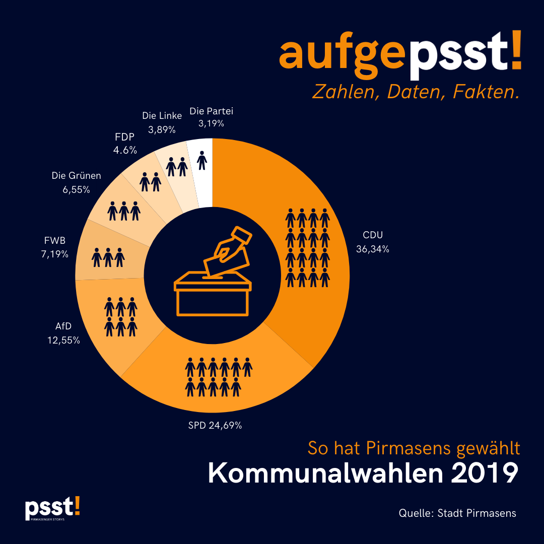 Bei der letzten Stadtratswahl am 26.05.2019 wurde die CDU mit 36,3 % der Stimmen stärkste Kraft. Die SPD landete mit 24,7% auf Platz 2. Der Stadtrat der Stadt Pirmasens besteht aus 44 gewählten Ratsmitgliedern. Die Wahlbeteiligung lag 2019 bei 47.5%.